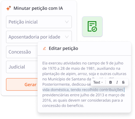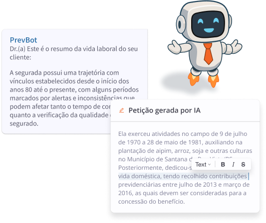 Agora você poderá conversar com o histórico contributivo do seu cliente, tirar dúvidas em segundos e ainda receber um diagnóstico completo de pendências, inconsistências e oportunidades de benefício. Além disso, você também poderá confeccionar seus requerimentos administrativos e petições iniciais de forma descomplicada e rápida, utilizando o gerador de petições, que formula a minuta a partir da leitura automática do processo administrativo do cliente ou do resumo do caso apresentado.